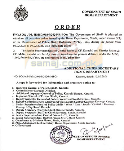 کراچی: (سماج نیوز) سندھ حکومت نے ایک اہم فیصلے کے تحت مینٹیننس آف پبلک آرڈر آرڈیننس (MPO) 1960 کے تحت جاری تمام نظر بندی کے احکامات واپس لینے کا اعلان…