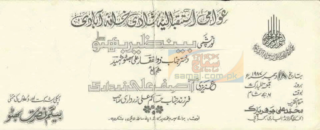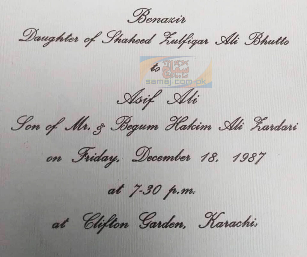 محترمہ بے نظیر بھٹو نے اپنی شادی میں شرکت کے لیے مجھے باقاعدہ دعوتی کارڈ عطا کیے۔ یہ دعوتی کارڈ ان کی والدہ، محترمہ بیگم نصرت بھٹو کی خصوصی ہدایت اور نگرانی میں تیار کروائے گئے تھے، جو اس تقریب کی اہمیت اور وقار کی عکاسی کرتے تھے۔