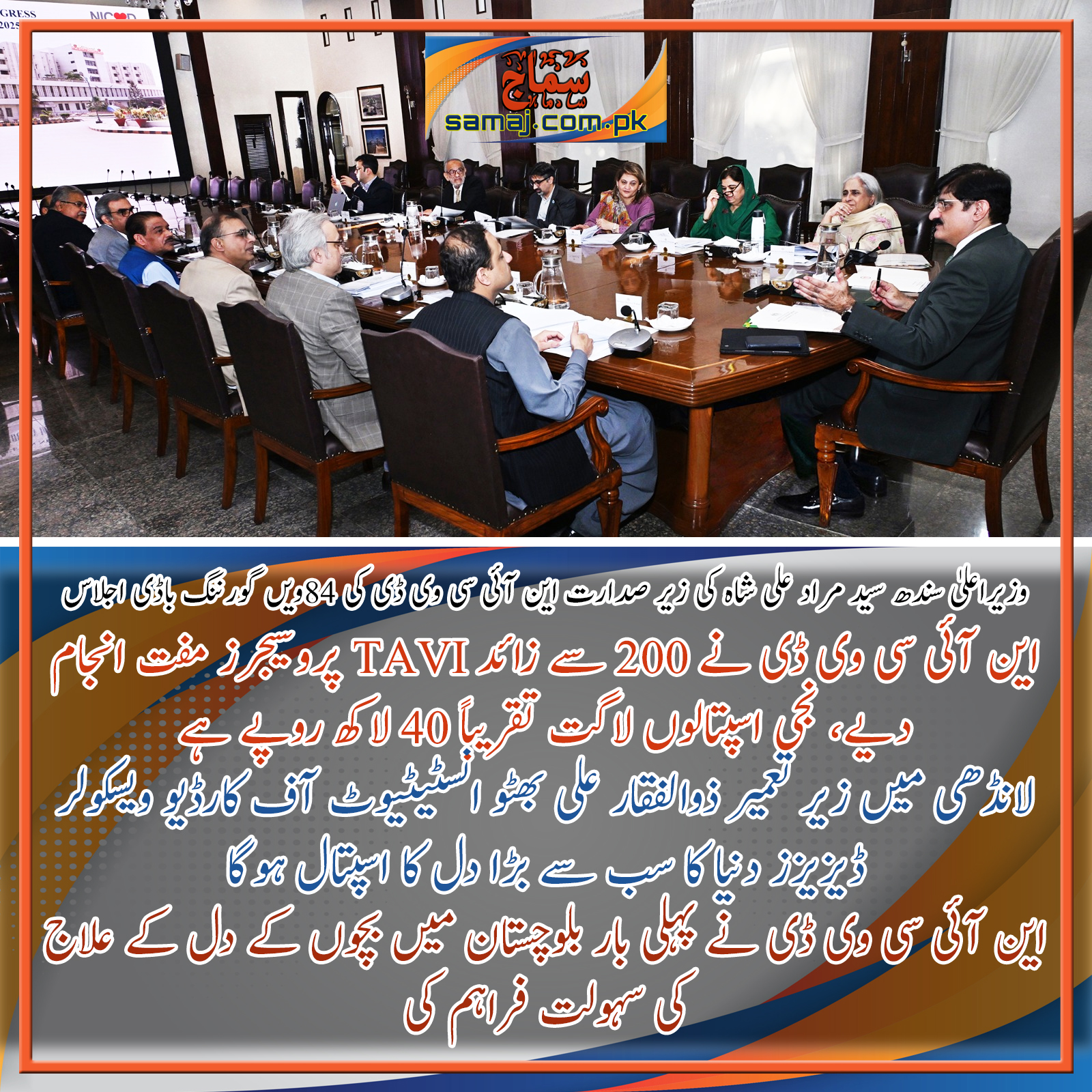 کراچی (سماج نیوز): وزیراعلیٰ سندھ سید مراد علی شاہ نے نیشنل انسٹیٹیوٹ آف کارڈیو ویسکیولر ڈیزیزز (این آئی سی وی ڈی) کے 84ویں گورننگ باڈی اجلاس کی صدارت کرتے ہوئے ادارے کے مستقبل کے تحفظ اور جان بچانے والی خدمات کے دائرہ کار کو وسیع کرنے کے لیے کئی اہم اور تاریخی فیصلے کیے۔ ان فیصلوں میں قانونی معاملات کی بحالی، بجٹ میں اضافہ اور انفراسٹرکچر کی ترقی پر خصوصی توجہ دی گئی۔ وزیراعلیٰ ہاؤس میں منعقدہ اجلاس میں وزیر صحت ڈاکٹر عذرا فضل پیچوہو، میئر کراچی مرتضیٰ وہاب، اراکین اسمبلی رخسانہ پروین اور سعدیہ جاوید، پرنسپل سیکریٹری آغا واصف، سیکریٹری خزانہ فیاض جتوئی، سیکریٹری صحت ریحان بلوچ، ایگزیکٹو ڈائریکٹر این آئی سی وی ڈی پروفیسر طاہر صغیر، مشتاق چھاپڑا اور دیگر نے شرکت کی۔ وزیراعلیٰ سندھ نے اجلاس میں فیصلہ کیا کہ تمام قانونی ابہامات کو دور کیا جائے تاکہ یہ عالمی معیار کا ادارہ بغیر کسی رکاوٹ کے عوام کی خدمت جاری رکھ سکے۔ ادارے کے انتظامی امور کو مزید پیشہ ورانہ بنانے کے لیے گورننگ باڈی نے اصولی طور پر ایک فل ٹائم چیف آپریٹنگ آفیسر (سی او او) اور چیف فنانشل آفیسر (سی ایف او) کی بھرتی کی منظوری دی، جو اوپن مارکیٹ میں مسابقتی عمل کے ذریعے کی جائے گی۔ وزیراعلیٰ سندھ نے محکمہ صحت کو ہدایت کی کہ بھرتی کے عمل سے قبل قواعد و ضوابط طے کیے جائیں۔ گورننگ باڈی کو بتایا گیا کہ مالی سال 26-2025ء کے دوران آپریشنل اخراجات پورے کرنے کے لیے فوری طور پر 3.5 ارب روپے کی اضافی گرانٹ درکار ہے۔ اجلاس میں بتایا گیا کہ وزیراعلیٰ سندھ کی جانب سے 10 ارب روپے کی منظوری دی جاچکی ہے، تاہم انتظامی اور سروس لاگت میں اضافے کے باعث ادارے کو مجموعی طور پر تقریباً 4.6 ارب روپے کے مالی خسارے کا سامنا ہے۔ وزیراعلیٰ سندھ نے سیکریٹری خزانہ فیاض جتوئی کی سربراہی میں ایک کمیٹی تشکیل دی جو این آئی سی وی ڈی کے بزنس ماڈل کا جائزہ لے کر اصلاحات تجویز کرے گی۔ وزیراعلیٰ سندھ نے یقین دہانی کرائی کہ کمیٹی کی رپورٹ پیش ہونے کے بعد درکار فنڈز کی منظوری دے کر جاری کر دی جائے گی۔ ایگزیکٹو ڈائریکٹر پروفیسر طاہر صغیر نے 2025ء کے دوران این آئی سی وی ڈی کی نمایاں کامیابیوں پر تفصیلی بریفنگ دی۔ انہوں نے بتایا کہ این آئی سی وی ڈی کراچی نے 2024ء میں 9,925 پرائمری اینجیو پلاسٹیز انجام دیں، جس کے ساتھ یہ ادارہ دنیا کا سب سے بڑا مرکز بن گیا۔ ادارے نے 200 سے زائد ٹرانس کیتھیٹر ایورٹک والو امپلانٹیشن (TAVI) کے آپریشنز مفت انجام دیے، جن کی نجی اسپتالوں میں لاگت تقریباً 40 لاکھ روپے فی آپریشن ہے۔ این آئی سی وی ڈی نے پہلی بار بلوچستان میں بچوں کے دل کے علاج کی خدمات فراہم کیں، جہاں 100 سے زائد سرجریز اور 300 سے زائد انٹروینشنز انجام دی گئیں۔ اسٹروک انٹروینشن پروگرام کے تحت 450 سے زائد طریقۂ علاج مکمل کیے گئے، جس سے متعدد مریض مستقل اعصابی معذوری سے بچ گئے۔ وزیراعلیٰ سندھ نے کئی بڑے انفراسٹرکچر منصوبوں کی پیش رفت کا بھی جائزہ لیا، جن میں 300 بستروں پر مشتمل نیا پیڈیاٹرک یونٹ اور لانڈھی میں زیر تعمیر ذوالفقار علی بھٹو انسٹیٹیوٹ آف کارڈیو ویسکیولر ڈیزیزز شامل ہیں، جو 1,200 بستروں پر مشتمل ہوگا اور دنیا کا سب سے بڑا دل کا اسپتال ہوگا۔ اجلاس کے اختتام پر وزیراعلیٰ سندھ نے ہدایت دی کہ این آئی سی وی ڈی اور ایس آئی سی وی ڈی کے انضمام اور انتظامی ہم آہنگی کے لیے جامع بزنس پلان تیار کرنے والی فرم کی تقرری کو جلد حتمی شکل دی جائے۔