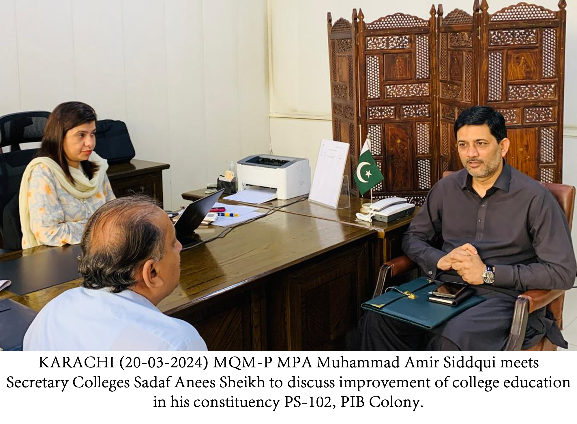 کراچی (20 مارچ) متحدہ قومی موومینٹ (پاکستان) کے رکن سندھ اسمبلی محمد عامر صدیقی نے آج سندھ سیکریٹریٹ میں سیکریٹری کالج ایجوکیشن ڈیپارٹمنٹ محترمہ صدف انیس شیخ سے ان کے دفتر میں ملاقات کی۔